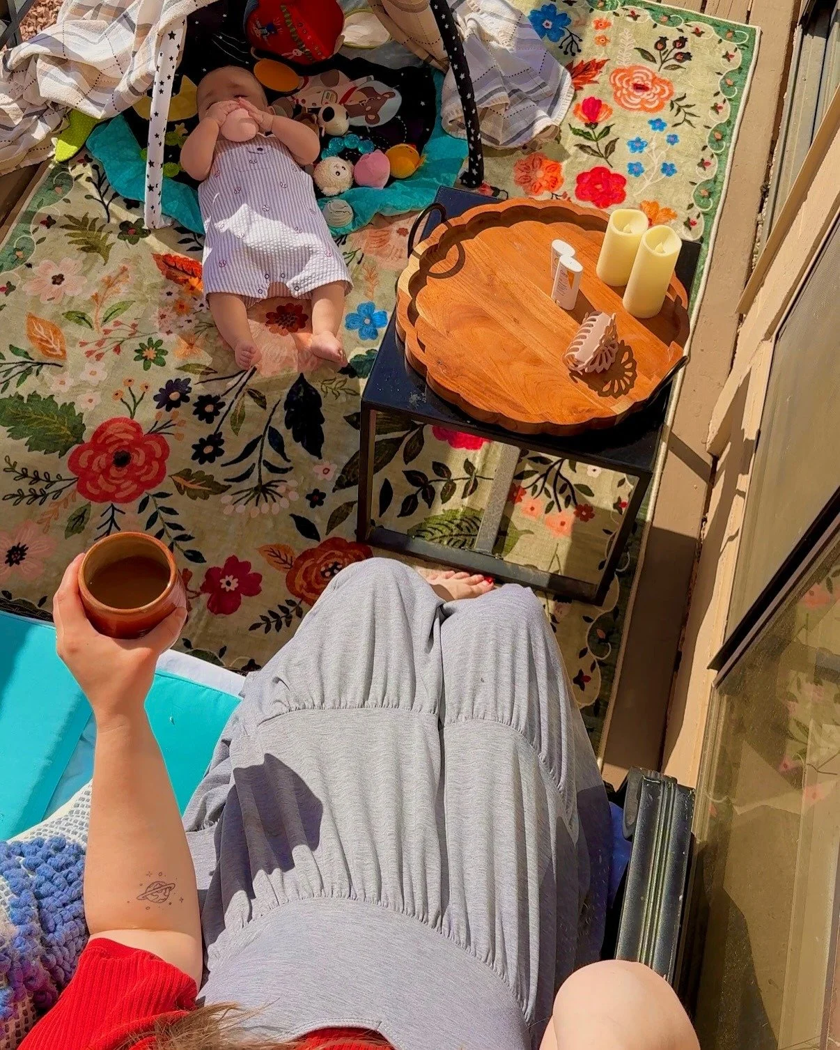 To tie everything into one cozy scene, an outdoor rug from Amazon brought in warmth and personality. Something cheerful, with a little pattern, that helped define the area and brighten the space underfoot. Rugs like this have a way of turning a simple setup into something that feels designed — even when it’s built on a budget.
