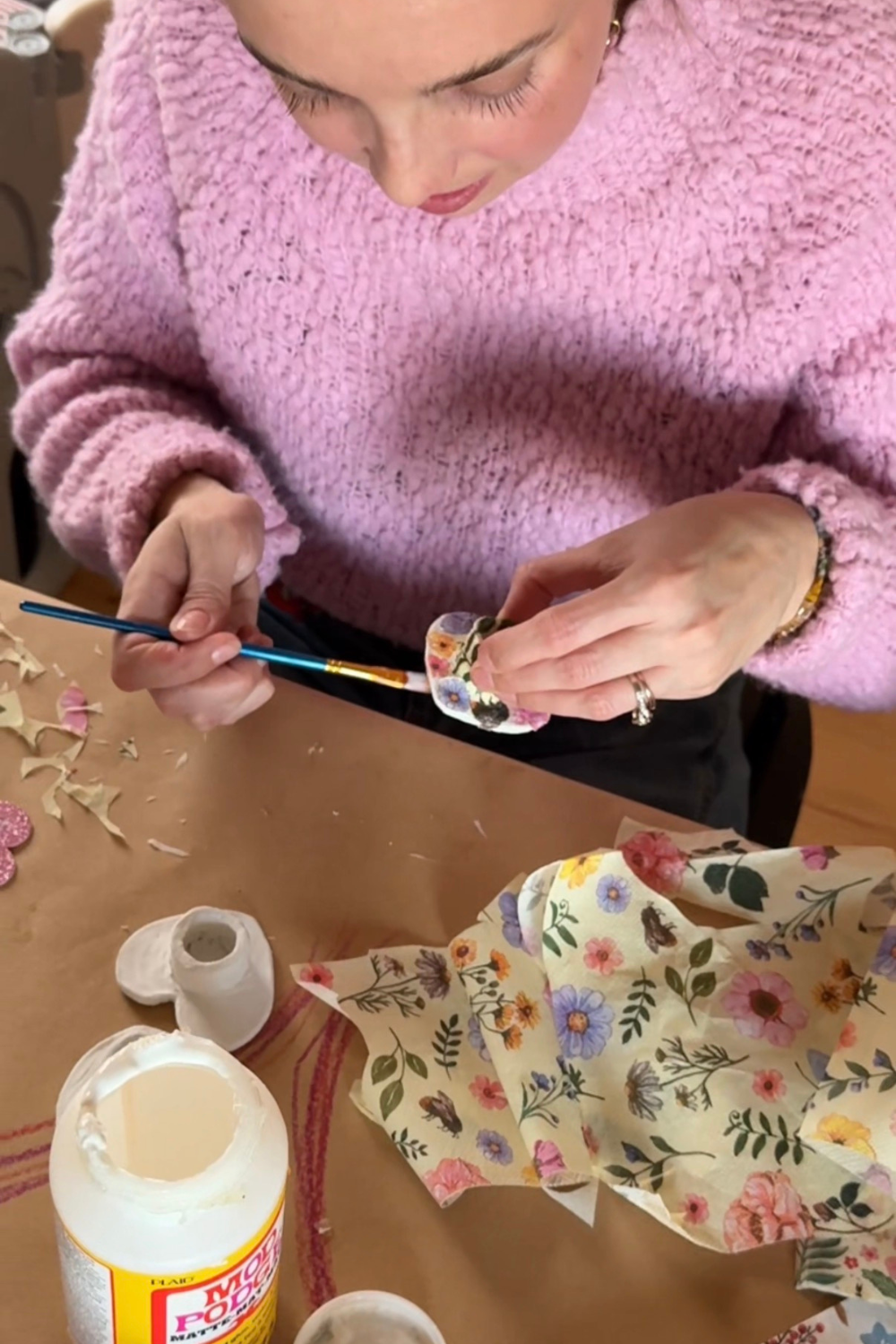 Apply more Mod Podge as needed to seal the napkin to the clay surface.